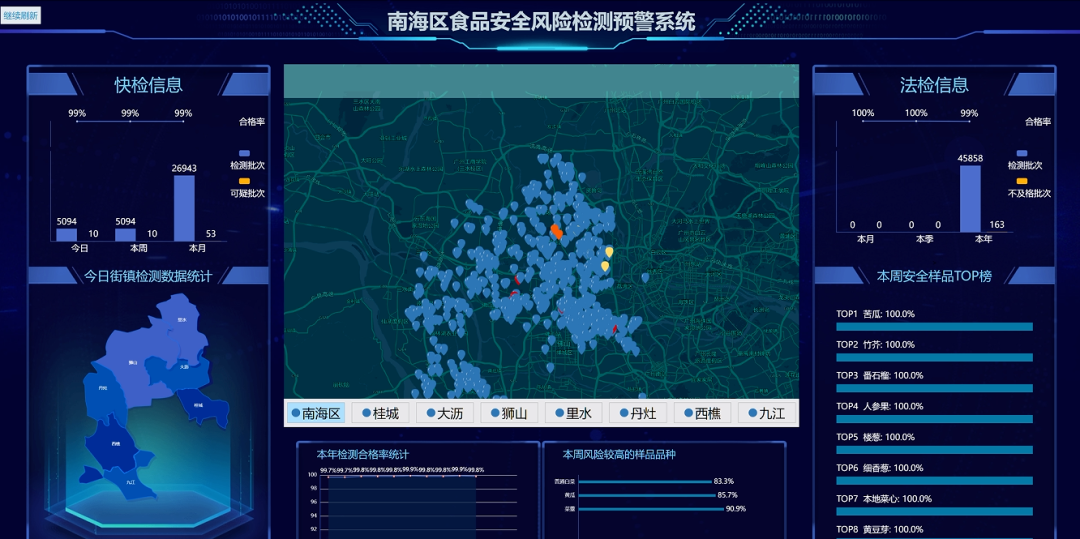 所有檢測信息均會實時上傳食品安全風(fēng)險檢測預(yù)警系統(tǒng),系統(tǒng)設(shè)置“今日鎮(zhèn)街檢測數(shù)據(jù)統(tǒng)計”“本年檢測合格率”“本周風(fēng)險較高的樣品品種”“本周安全用品TOP”“快檢信息”“法檢信息”六大模塊內(nèi)容,對收集到的數(shù)據(jù)進行分析,形成“南海區(qū)食品快檢數(shù)據(jù)”地圖。