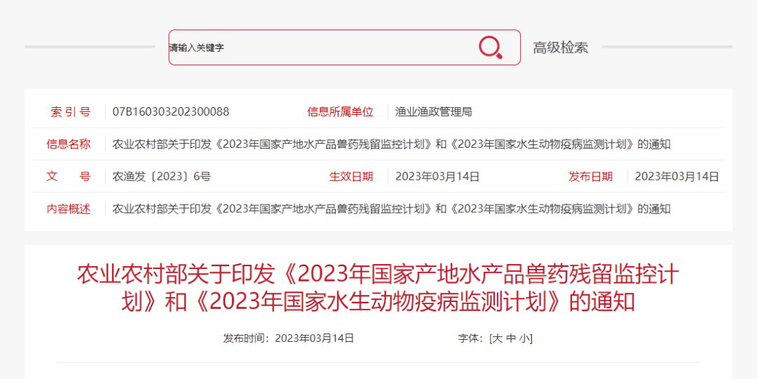 資訊 | 農(nóng)業(yè)農(nóng)村部發(fā)布《2023年國家產(chǎn)地水產(chǎn)品獸藥殘留監(jiān)控計劃》