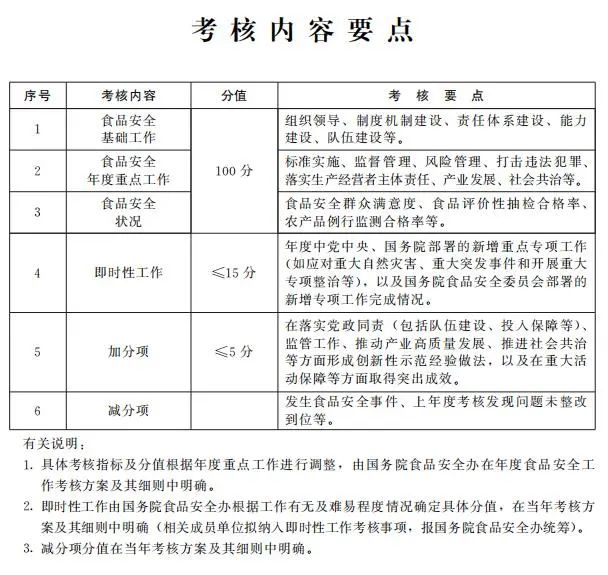第五條 考核內(nèi)容主要包括食品安全基礎(chǔ)工作推進(jìn)、年度重點(diǎn)工作落實(shí)、食品安全狀況等,同時(shí)設(shè)置即時(shí)性工作評(píng)價(jià)和加減分項(xiàng)(考核內(nèi)容要點(diǎn)見附件)。具體考核指標(biāo)及分值在年度食品安全工作考核方案及其細(xì)則中明確,設(shè)置要科學(xué)合理,可操作、可評(píng)價(jià)、可區(qū)分,切實(shí)減輕基層負(fù)擔(dān)。