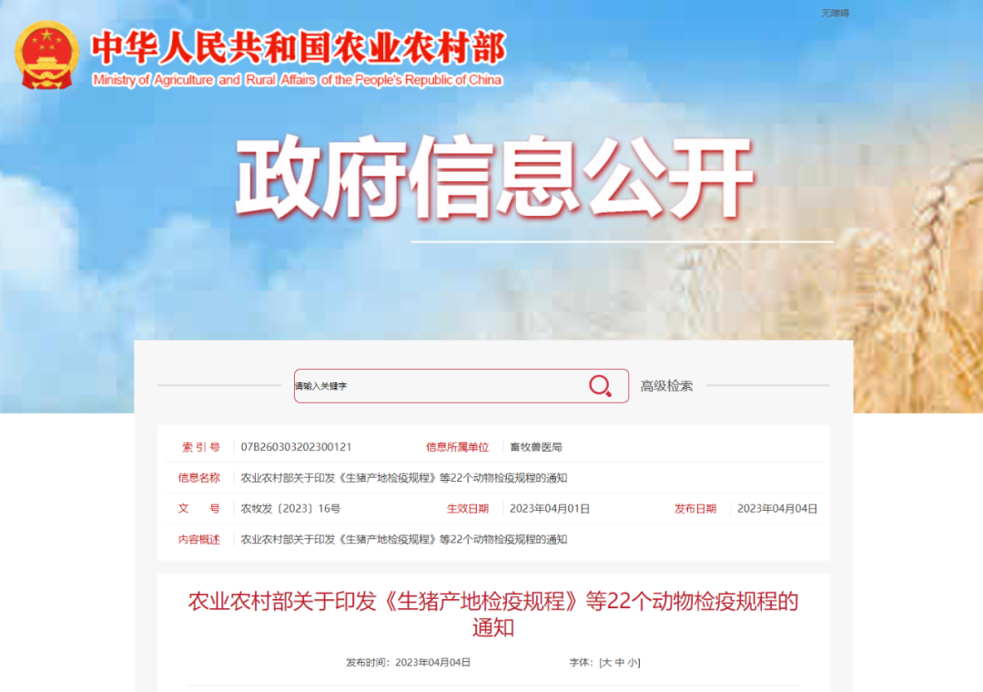 政策發(fā)文 | 農(nóng)業(yè)農(nóng)村部關于印發(fā)《生豬產(chǎn)地檢疫規(guī)程》等22個動物檢疫規(guī)程的通知